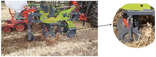- Based on the actual operation conditions and requirements, the working parameters of the mechanism were optimized, and field tests were conducted. Taking the soil disturbance rate and straw return status as the test indices, an optimization analysis of the design parameters was carried out. Field test data showed that the machine achieved the best operation performance when the forward speed was 8.5 km/h, the front–rear position distance parameter was −10.2 cm, and the deflection angle was 8.5°. Under these conditions, there was no large clod of soil remaining in the seedling belt after operation, and the surface soil was flat. The tests also revealed that no obvious straw sliding occurred after operation, and only a small amount of straw remained in the planting seedling belt, which did not affect the subsequent sowing quality. After parameter optimization, the operation performance of the machine was significantly improved.