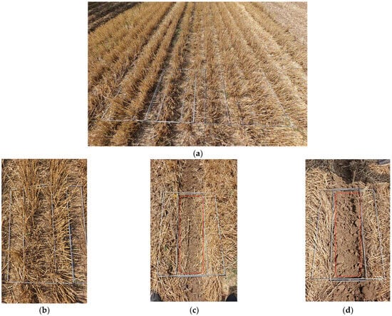 To test the field performance of the designed imitation pressure stubble diversion device [], field experiments were conducted during the summer corn-sowing period in Shandong Province []. Wheat stubble plots without any mechanical work after harvesting were selected. Based on the optimized design of the optimal combination parameters, the prototype was tested and installed after the straw-cleaning device of the strip land preparation machine. We used a tractor for towing operations. The cross-sectional view of the prototype is shown in Figure 14, the experimental plots are shown in Figure 15a.