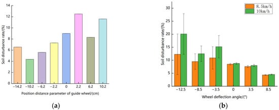 The test results were analyzed by response surface analysis using Design-Expert software, as shown in Figure 13 []. By analyzing Figure 13a, it can be seen that when the control offset angle parameters remained unchanged, when the speed was lower than 8 km/h, the test indicators gradually decreased with the backward movement of the position. When the device moved forward at high speed, the test indicators increased significantly. The test indicators were better when the position distance factor was at a negative value. By analyzing Figure 13b, it can be seen that when the control wheel position distance remained at a negative value, the test indicators would not change significantly with the increase in speed, and the effect of the angle on the indicators was not obvious. When the control device was running at the same speed, as shown in Figure 13c, it can be seen that the angle and position interacted with the test indicators. When the position distance parameter was at a negative value and the angle offset parameter was positive, the soil loss rate was low and the inter-row interference was small.