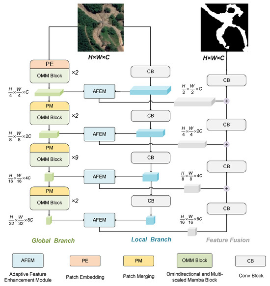 Landslide detection using high-resolution remote sensing imagery faces not only challenges in multi-scale feature extraction but also the inherent complexity of landslides. This complexity, which arises from the high intra-class variability in size, shape, spectral signature, and surrounding context of landslides, necessitates a robust detection algorithm capable of effectively adapting to diverse terrain features and landslide morphologies. To this end, this study proposes MSCG-Net, a dual-branch fusion network that integrates Mamba and CNN modules. The overall architecture of the network is shown in Figure 1, and its main components are described as follows:
