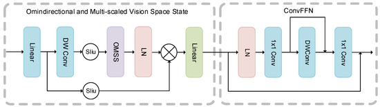Architecture of the OMM Block, composed of the Omnidirectional Multiscale Visual State-Space Block (OMVSS), which improves the VSS scanning mechanism for multiscale and omnidirectional feature modeling, and the Convolutional Feedforward Network Block (ConvFFN), which complements VSS by enhancing spatial feature extraction.