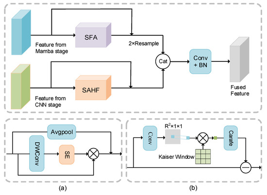 SAHF enhances edge features in the convolutional branch (see Figure 5b). Convolutions with limited receptive fields may overlook fine details in complex regions. To further enhance boundary features, the SAHF module integrates a high-pass filter to highlight edges and suppress low-frequency components. Additionally, a Kaiser window is applied to mitigate spectral leakage and reduce artifacts, ensuring cleaner and more accurate feature extraction. On top of this, Carafe adaptively generates content-aware filter kernels to further improve detail perception and enhance the model’s ability to recognize fine boundaries. For features , initial filter kernel weights are predicted by a convolutional layer.