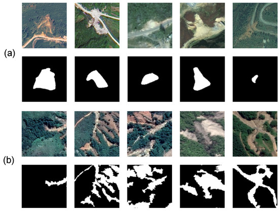 Landslide datasets. (a) Example from the Bijie dataset. (b) Example from the GVLM dataset.