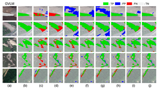 Landslide detection results comparing with 6 state-of-the-art approaches on GVLM dataset. (a) Optical RSIs; (b) GT; (c) DeepLabV3+; (d) DANet; (e) AttUNet; (f) TransNet; (g) Nested Attention U-Net; (h) SegFormer; (i) VMUNet; (j) MSCG-Net (ours).