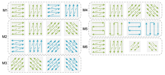Scanning methods for comparison. Green arrows indicate the forward scanning order, and blue arrows indicate the reverse scanning order.