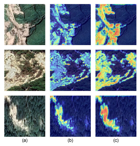 To further validate the effectiveness of the convolutional branch in preserving boundary features, this study generated a heatmap using Gradient-weighted Class Activation Mapping, as shown in Figure 13. This visualization highlights the distinct focus areas of the convolutional and Mamba branches in extracting landslide features. Specifically, the Mamba branch highlights the overall structure and long-range connections within the landslide area, whereas the convolutional branch concentrates on boundary contours and fine-grained details. By organically integrating the strengths of both branches, the proposed model effectively compensates for the Mamba branch’s limitations in local feature representation while retaining its strengths in capturing large-scale semantics and global context. This results in a robust feature extraction framework with both global and local perceptual capabilities.