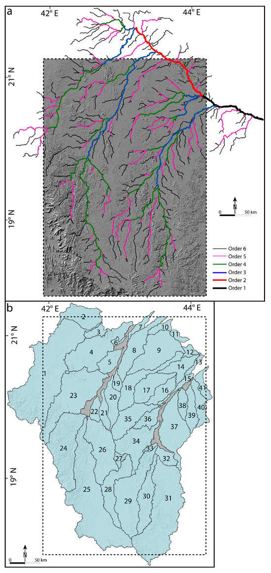 (a) Stream orders and (b) catchments (1–41) extracted from the study fault zone. Dashed square indicates the study NFZ.