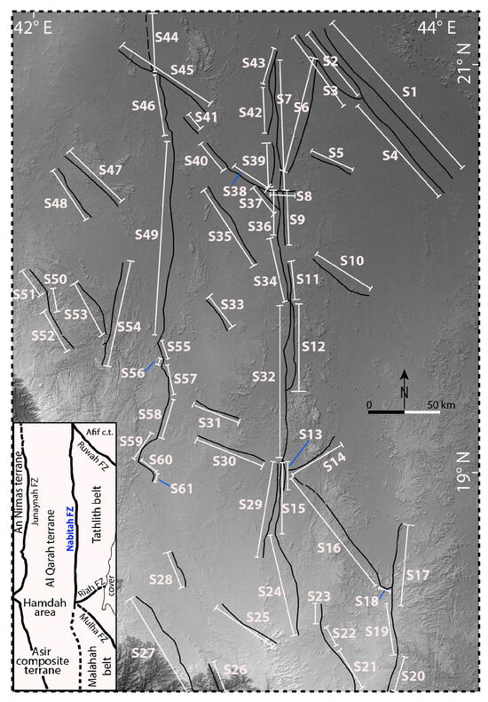 The NFZ, also known as the Nabitah suture, is located in southwestern Saudi Arabia, along the axis of the Arabian Shield between latitudes 19° N and 22° N and longitudes 42° E and 44° E (Figure 1). The NFZ system, which is extended over 900 km, is identified by a locus of north-trending, fault-bounded serpentinite bodies [26]. The Nabitah suture zone refers to both the Nabitah fault system and a belt of foliated grano-dioritic plutonic rocks that are connected to it [20,25]. Based on comparisons between scale models and recent Phanerozoic volcanic arcs, the NFZ may have formed as a transform fault in the frame of sinistral oblique subduction east of the Al Amar fault [20]. The north–south NFZ is recognized and mapped between the two major terranes: Tathlith–Malahah and Al Qarah terrane, which are situated east and west of the fault zone (Figure 1), respectively [18,27]. In this work, the term terrane refers to a fault-bounded crustal block that is distinct from its surrounding blocks in terms of geological history and rock assemblage. Terranes like those seen in Saudi Arabia are the remains of ancient island arcs, oceanic crust, and microcontinents that were accreted and sutured together as part of the Arabian–Nubian Shield assembly in the late Proterozoic.