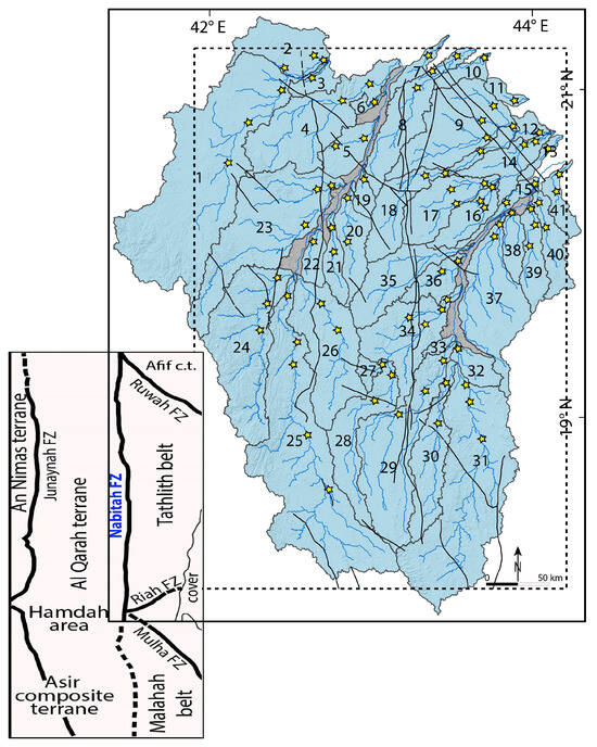 Numerous studies have successfully used geomorphic indices to test and read dynamic landscapes in several different environmental conditions (e.g., [3,6,14,15,16,17]). These methods have been especially valuable and effective in regions with little paleoseismic and geodetic data. Thus, drainage system and basin morphometry serve as an indirect useful technique for reading and understanding the relative uplift rates, fault activity, and landscape reaction periods in these situations [11]. However, such integrated tectonic geomorphic studies are still few in Saudi Arabia’s Arabian Shield, especially along the Nabitah Fault Zone (NFZ), a significant Neoproterozoic suture and crustal-scale fault system. The quantitative description of active deformation and its effects on the environment is lacking since previous studies have mostly concentrated on regional geology and geochemistry analysis [18,19].