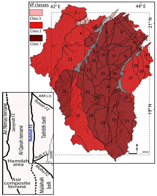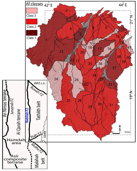 The study of active tectonic processes through the analysis of landforms, or tectonic geomorphology, provides a powerful tool for identifying areas of crustal deformation where direct evidence of faulting may be absent or obscured [6,39]. In regions like the Nabitah Fault Zone (NFZ), a significant Proterozoic structure whose neo-tectonic importance is unclear, this method is especially helpful. The rates and types of crustal deformation can be inferred by examining different landforms including drainage patterns, fault scarps, river terraces, and raised sea platforms [16,48]. Following the methodology established and developed by several authors (e.g., [2,6,7,15,43]), this study applied a set of geomorphic indices including mountain front sinuosity, valley floor width-to-height ratio, basin shape, hypsometric integral, and asymmetric factor to assess relative tectonic activity. This method’s strength lies in the integration of the used indices to create a composite index of relative tectonic activity (TA), which provides a reliable, semi-quantitative evaluation of how the landscape responds to deformation over a wide region.