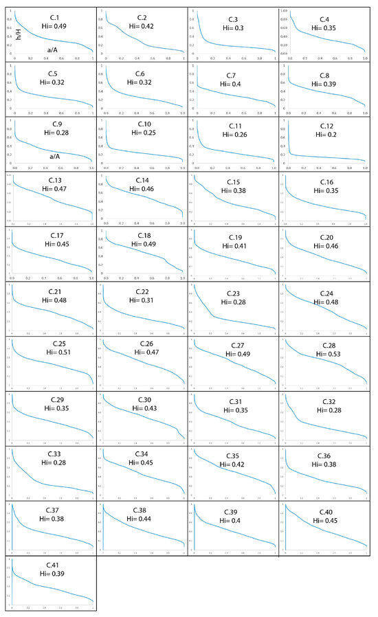 The hypsometric integral index is an important factor in relief description in different landscapes. It characterizes the distribution of height in a specific area or landscape [46]. This informative parameter represents the volume of a basin that has not been eroded and is generally recognized as the total area beneath the hypsometric curve [43]. A formula that might be applied to calculate this index is stated as: