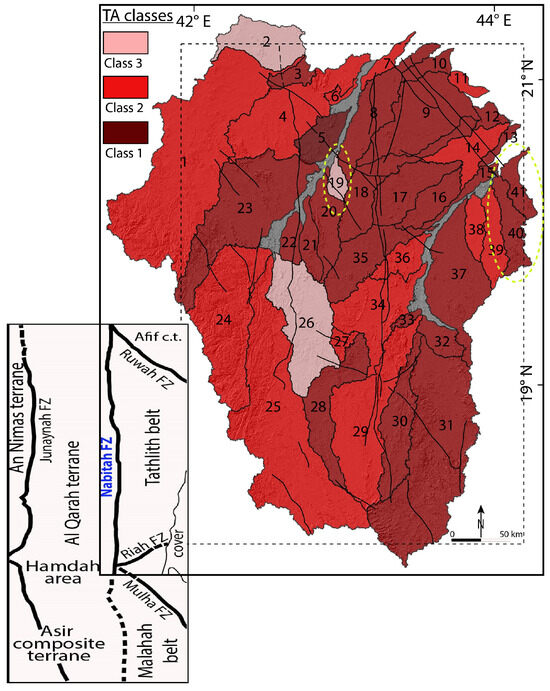 In this study, considering the evaluation of the tectonic activity indicated by the TA index (Figure 10) is essential to discuss the implications of environmental sustainability and seismic hazard assessment of the NFZ region. A late Proterozoic (~670–640 Ma) intra-arc suture [18], a basic lithospheric feature, is continuously reactivated rather than merely a snapshot of recent deformation. According to geomorphic study, the existing landscape is a definite example of this structure’s reactivation under the current stress field, which was probably impacted by the combined pressures of the Red Sea extension and the Zagros continental collision [39]. The convergence of evidence, including elongated basins (High Bsh), young landscapes (High Hi), laterally tilted catchments (High Af), and the synergistic combination of straight mountain fronts (Low Smf) with V-shaped valleys (Low Vf), identifies the central NFZ and its major splays (Mulha, Riah) as zones of concentrated strain. This quantitative evaluation of ongoing tectonic activity has immediate and significant ramifications for the NFZ region’s seismic hazard assessment and environmental sustainability, two areas that have received very little attention. Continuous deformation is a major activity behind landscape evolution, impacting important environmental elements such soil formation, erosion patterns, groundwater aquifer shape, and flora distribution in this arid area. These dynamic tectonic boundaries must therefore be taken into consideration in sustainable land-use planning and water resource management. Roads, pipelines, and urban growth are examples of infrastructure projects that should be planned to avoid locations with high TA values (such as catchments 8, 15, 30) to reduce the danger of fault rupture, ground shaking, and related secondary hazards like landslides [18,19,20,39].