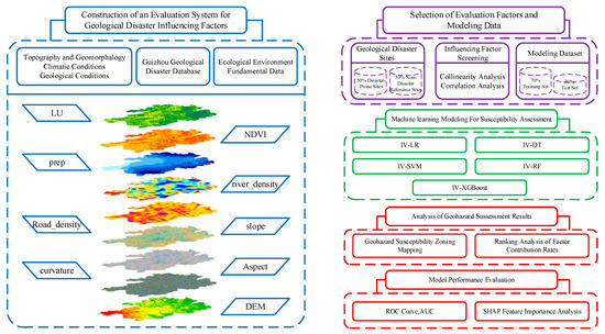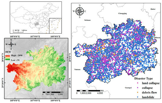 Affected by global climate change, the frequency and intensity of extreme disaster events worldwide have shown a significant increasing trend, triggering a series of meteorological, flood, drought, and geological disasters [1]. China has a vast territory and diverse, complex geological structures, making it one of the countries with the most severe geological disasters in the world [2]. As the population expands and urbanization accelerates, land resources undergo increasingly frequent development and utilization, which heightens geological disaster risks that, in turn, pose grave threats to lives, property, and regional sustainability [3]. As of the end of 2022, a total of 28,172 potential geological disaster points and high-risk slopes have been identified in the province, threatening more than 2 million people. Among them, 10,475 potential hazards exhibited obvious deformation, including 5317 landslides, 3087 collapses, 119 debris flows, 1365 unstable slopes, 507 collapses, and 80 ground fissures. Additionally, 17,697 risk slopes had not shown deformation but still had conditions that could lead to disasters [4]. The total area of high- and medium-susceptibility areas in the province was 154,800 square kilometers, accounting for 87.9% of the land area [5]. Due to the unique karst geological environment and complex geological conditions in Guizhou Province [6], it is crucial to select appropriate influencing factors and training models for evaluating the susceptibility of geological disasters.