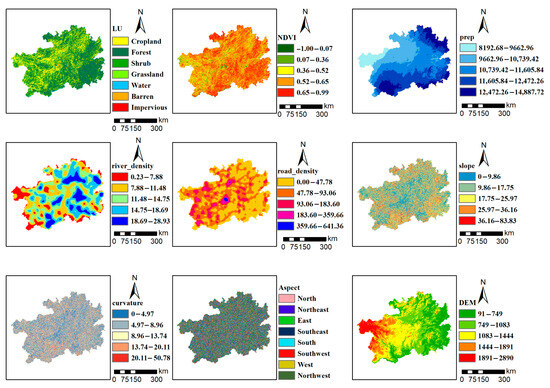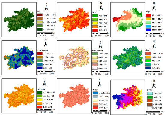 The occurrence of geological disasters is a complex, non-linear process formed by the combined action of various internal and external factors. Drawing a geological disaster susceptibility map is the core method for identifying the spatial distribution of potential geological disasters. Currently, there is no established standard for selecting evaluation factors for geological disaster susceptibility. The main principles include that the evaluation factors should be measurable, operable, relevant to the disaster occurrence mechanism, and have low redundancy among them [58]. Existing studies have shown that topography is one of the main factors leading to the occurrence of geological disasters [59]. Liu Shuai et al. [60] used factors such as slope, aspect, elevation, curvature, and terrain relief as evaluation indicators. Combining the regional disaster-forming characteristics, this study primarily focuses on the dynamic factors (topography, ecology, hydrology, and human activities) that can be remotely sensed at the surface, as well as the basic geological and hydrological conditions (drainage density). Although the literature [61,62] indicates that lithology is crucial, due to the limitation of obtaining high-resolution regional lithology maps, this factor is not included in this evaluation system. This study finally selected nine influencing factors as evaluation indicators (Table 3, Figure 4).
