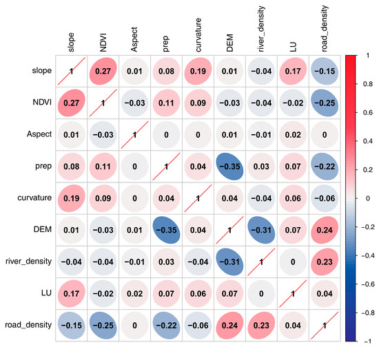 The mechanism of geological disasters is relatively complex and often the result of the combined action of multiple environmental impact factors. Therefore, to address the issue of low model evaluation accuracy resulting from high correlation among ecological impact factors, this study proposes the use of a correlation analysis method to conduct an independent test on these impact factors. To avoid excessive mutual interference between factors, it is necessary to consider the correlation of each factor and delete duplicate impact factors. This paper employs Pearson correlation coefficients (PCCs) to conduct correlation and collinearity analysis on the selected factors, testing the independence of evaluation factors. PCCs, as a bivariate factor correlation analysis method with high evaluation accuracy, are used to compare the correlation degree of each factor. The greater the absolute value, the stronger the correlation [57]. In general, there is no correlation when 0.3 > |PCCs| > 0; when 0.6 > |PCCs| > 0.3, the correlation is low; when 0.8 > |PCCs| > 0.6, there was a moderate correlation; there was a high correlation between the selected evaluation factors when 1 > |PCCs| > 0.8 [21]. As shown in Figure 5, the Pearson correlation analysis reveals that the absolute value of the correlation coefficient between the nine evaluation factors was less than 0.60 (range: −0.31 to 0.45), which is significantly lower than the threshold for strong correlation (|PCCs| > 0.8). This indicates that there is only a weak correlation between factors, which meets the requirements of low collinearity in modeling and effectively avoids the interference of multicollinearity on the prediction model.
