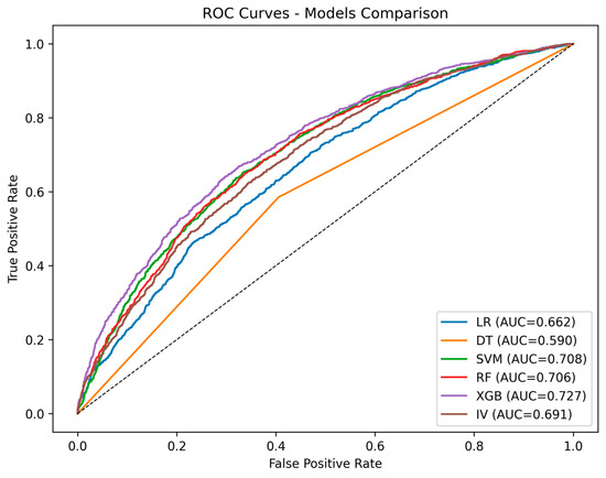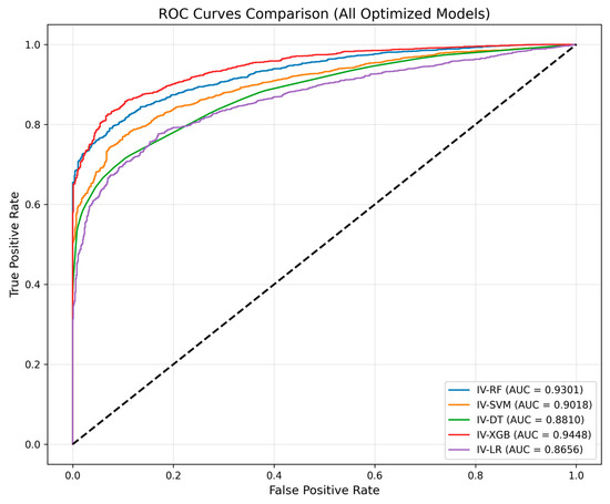 Bayesian optimization belongs to a class of algorithms that implement hyperparameter search based on prior knowledge [34]. As a global optimization method, its core advantage is that it can find the global optimal solution within a limited number of iterations, that is, the optimal hyperparameter combination. In this study, a Bayesian optimization algorithm was employed to optimize the hyperparameters of five coupling models: IV-LR, IV-DT, IV-SVM, IV-RF, and IV-XGB. According to the characteristics of each model, by itself it is used as the base model, and the AUC value of the test set is used as the objective function to evaluate the performance of the hyperparameter combination. In the optimization process, the probability model of the objective function is constructed by historical sampling, and the next set of hyperparameters to be evaluated is selected based on the expected improvement (EI) acquisition function. Iterations are updated until convergence or the maximum number of iterations is reached, allowing for the determination of the optimal hyperparameter configuration for each model. The experimental model parameters are set as shown in Table 2.
