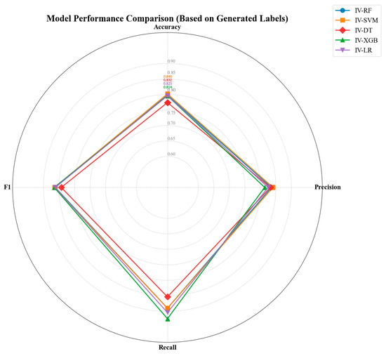 Radar chart comparing the performance metrics of different IV-ML models.