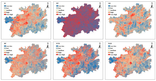 In this study, Guizhou Province was taken as the research object, and after the susceptibility index was calculated, the study area was divided into five susceptibility levels: extremely low, low, medium, high, and extremely high, by the Jenks natural breaks optimization method. The statistical data on the distribution of disaster points in different subregions for each susceptibility evaluation model have been compiled in Table 5. From the perspective of the spatial distribution pattern, the results of all coupled models showed that the geological hazard susceptibility in Guizhou Province presented the characteristics of “high in the north and middle, low in the south and east”: the northern and central regions were mainly extremely high and high susceptibility areas, while the southern and eastern regions were mainly extremely low and low susceptibility areas (Figure 9 and Figure 10, Table 5).