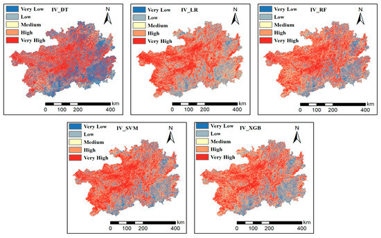 (3) The study revealed significant differences in the performance of the coupled models. Among them, the IV-RF, IV-SVM, and IV-XGB coupling models can serve as core decision-making bases due to their balanced zoning, continuous gradients, and high prediction accuracy (AUC > 0.90). In contrast, the IV-DT and IV-LR models exhibited broken risk gradients and should be applied with caution. This study validates the effectiveness of the coupling framework between the information value model and machine learning algorithms in complex geological environments, providing multiple optimized modeling options for disaster prediction in Guizhou Province and similar regions.