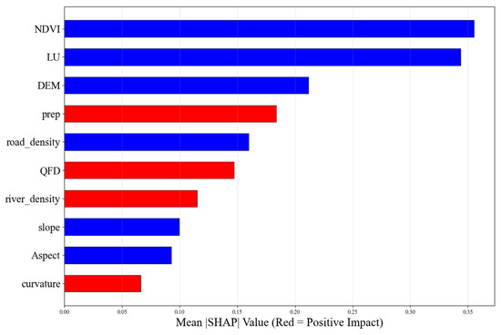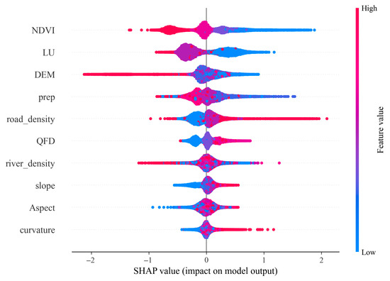 As shown in Figure 11, the SHAP feature summary diagram provides an intuitive representation of the contribution methods and influence directions of each influencing factor on the geological disaster susceptibility prediction model. Each point in the figure represents a sample point, and its color indicates the value of the corresponding factor at that sample point—red represents a high value, and blue represents a low value; the horizontal axis is the SHAP value, which is used to measure the contribution degree of the factor to the model output, and a positive value indicates that this factor will increase the predicted probability of geological disaster occurrence. The analysis results show that the normalized difference vegetation index (NDVI) is the factor that has the most significant impact on the model output. The lower its value, the higher the SHAP value, indicating that geological disasters are more likely to occur when the vegetation coverage is low; land use type (LU) and elevation (DEM) also have significant impacts. Among them, the lower the elevation, the larger the SHAP value, indicating that the probability of disaster occurrence increases accordingly. The mean annual precipitation (prep), road density (road-density), terrain undulation degree (QFD), and river density (river-density) all show significant influence. The greater the road density, river density, and degree of terrain undulation, the higher the SHAP value, indicating an increase in disaster risk. Factors such as slope, aspect, and surface curvature make specific contributions to the model prediction, but their overall impact is relatively weak.
