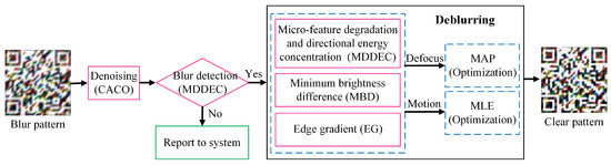 (3) Security pattern deblurring: Given that methods formulated for natural images typically do not exhibit good generalization to patterns, researchers have devised several effective priors grounded in the characteristics of QR codes. For example, Shi et al. [28] put forward a line search method grounded in binary property metrics with the aim of reducing the time consumed in searching for the optimal blur kernel. Nevertheless, this approach is solely applicable to linear blur in conveyor belt scenarios, and its applicability is severely restricted. Rioux et al. [29] proposed a barcode blind deblurring method based on Kullback–Leibler scattering. The method recovers the code by minimizing the KL scattering between the blurred barcode and the clear barcode, making it particularly suitable for motion blur. However, it may require significant computational resources, and its performance may be degraded when dealing with low-quality or extremely blurred barcodes. Chen et al. [30] introduced a fast QR code recovery method for blur caused by inaccurate focusing. The method incorporates edge prior information into the code sensing stage, resulting in faster recovery and improved quality. However, the accuracy is dependent on the prior information and parameter settings. Improper settings may negatively impact the recovery effect, particularly in cases of complex blurring or noise interference. Chen et al. [31] presented a method that directly estimates image sharpness based on image gradient features. This method can halt multi-scale iteration estimation at a scale enabling QR code recognition. However, in practical applications where the scene changes frequently, its implementation proves to be challenging. Li et al. [32] extracted the key features of the blurred QR codes, binarized them using an improved adaptive thresholding method, and finally decoded them. This method is effective in solving the blur caused by rapid camera or object movement, with a high recognition rate and computational efficiency able to meet the demands of real-time applications. However, further optimization may be necessary when dealing with complex blurring patterns. Zheng et al. [33] proposed a blind deblurring method for anti-counterfeit 2D codes that combines intensity and gradient priors. This method is specifically designed for security QR codes with specific localization patterns, and it can accurately recover blurred QR codes by considering local intensity and gradient information. Xu et al. [34] proposed an approach that capitalizes on local maximum and minimum intensity priors. This algorithm adaptively performs binarization of the intensity within the maximum a posteriori framework, resulting in a significant enhancement in computational efficiency. Eventually, latent image estimation and kernel estimation are alternately solved within the framework until convergence is achieved.