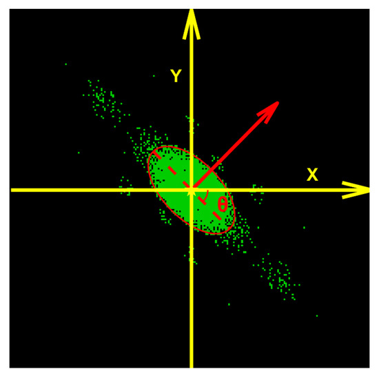 Here, two discriminative features are extracted: Micro-feature degradation metric (A): This metric is calculated as the ratio of non-zero pixels in the binary spectral mask to the total number of pixels in region R. It serves to measure the sparsity of the remaining high-frequency components. A higher degree of blur severity leads to a more significant degradation of fine details, corresponding to lower values of A. Directional energy concentration: The binary map undergoes further processing to retain only the significant regions. The orientation of the largest connected component is obtained through ellipse fitting. This orientation indicates the dominant direction of spectral energy spread, which is a characteristic feature of motion blur. Additionally, the axis ratio is computed by projecting the binary map onto the x- and y-axes. This ratio provides a measure of spectral symmetry. Defocus blur demonstrates high symmetry (), while motion blur exhibits anisotropy.