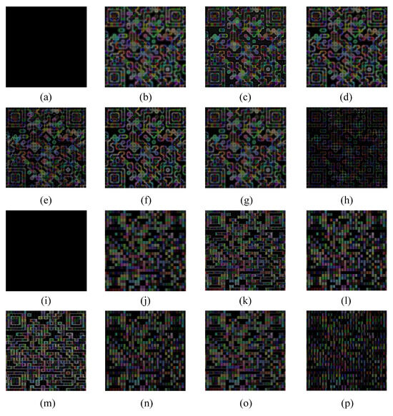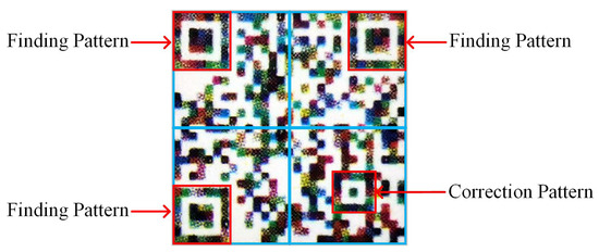The definitions of functional patterns are shown in Figure 6. Figure 7 shows the finder patterns of the patterns and their corresponding prior graphs. It can be observed that the MBD distribution of the blur pattern is much denser. This visual difference is mainly attributed to the structural characteristics of the functional graph. The functional graph comprises three layers: the outermost and innermost layers mainly consist of dark pixels, while the middle layer is close in gray value to bright pixels. The blurring of the pattern causes the dark pixels in the inner and outer layers to spread to the middle layer and compress the bright pixels, resulting in a decrease in their gray value. The binarization process converts bright pixels to zeros once a certain threshold is reached. This results in a higher concentration of dark pixels in the blur pattern, making the MBD appear denser. In addition, the convolution operation of the Sobel operator further accentuates the visual contrast between clear and blur patterns. This operation effectively enhances the edge information of the clear pattern, making the edges more prominent.