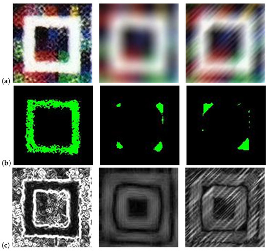 Progressive blur degradation simulation of security patterns is shown in Figure 3. Blur patterns can be deblurred by blur-kernel-based deconvolution, while minimizing the effect of noise on the deconvolution process. However, since the blur kernel is usually unknown, deconvolution becomes an ill-posed problem with multiple possible solutions. Therefore, it is usually necessary to perform blur estimation beforehand by utilizing the information and features of the blur pattern. The potential blur kernels are identified, and the pattern is then deblurred through deconvolution. The efficacy of the deblurring process is contingent upon the precision of the blur kernel estimation and the selected deblurring methodology. Two common types of blur in image processing are defocus blur and motion blur. The essential difference between these two types of blur lies in the difference in their blur kernel functions. In order to investigate the blur parameters more accurately, it is necessary to categorize the different types of image blur and use corresponding processing methods according to the different types. To facilitate this classification and subsequent processing, we initially formalize the kernel functions associated with these two primary types of blur: