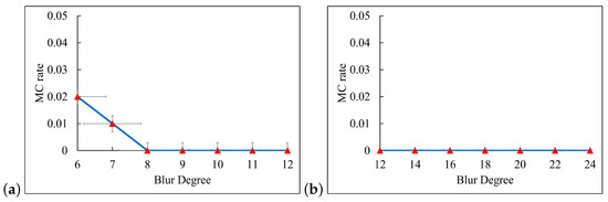 Misclassification rate (MC) of MDDEC module. (a) defocus blur; (b) motion blur.