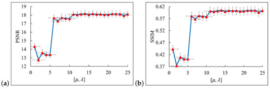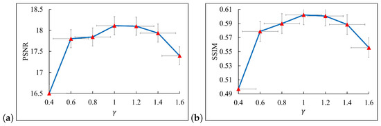 In the deblurring algorithm employed in this study, the optimal values of several crucial parameters are affected by multiple factors and must be set in conjunction with the actual scenario and practical experience. To identify the optimal configuration, a series of experiments were conducted. We randomly selected 100 patterns from the smartphone-based artificial blur dataset as validation samples. Figure 9 shows the deblurring effects under different values (0.4, 0.6, 0.8, 1, 1.2, 1.4, 1.6). The experimental results indicate that when equaled 1, both the PSNR and SSIM reached their optimal values. Additionally, is a dynamic threshold, initialized as = 2*. we evaluated the defuzzification effects of parameters and under different combinations (specifically, 25 combinations are presented in Table 3). As shown in Figure 10, the algorithm exhibited the best performance under the configuration of combination No. 14.