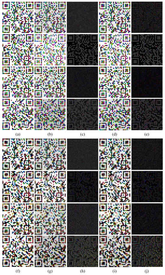 Visual comparison of CACO on noised dataset. (a) digital clear patterns; (b) digital noised patterns; (c) error images between (a) and (b); (d) digital denoised patterns; (e) error images between (a) and (d). Rows from top to bottom correspond to brown, Gaussian, salt and pepper, and speckle noise, respectively. (f) smartphone-based clear patterns; (g) smartphone-based noised patterns; (h) error images between (f) and (g); (i) smartphone-based denoised patterns; (j) error images between (f) and (i). Rows from top to bottom correspond to brown, Gaussian, salt and pepper, and speckle noise, respectively.