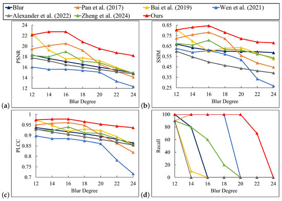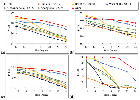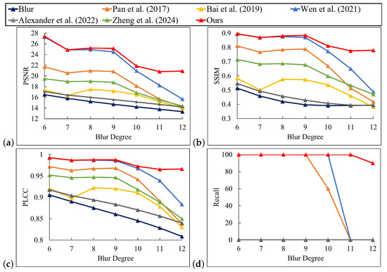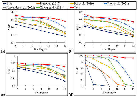 Six deblurring methods were used to process the smartphone-based artificial blur dataset, and the experimental results are shown in Figure 16 and Figure 17. All types of deblurring algorithms tend to generate artifacts. However, the artifacts produced by the method proposed in this paper were less prominent. They were more visually inconspicuous, fragmented in form, and sparsely dispersed. Meanwhile, the overall pixel intensity of its error image was lower, the fidelity was higher, and the comprehensive performance was superior. The methods of Pan et al. [6], Bai et al. [8], Alexander et al. [12], and Zheng et al. [33] resulted in significant distortion when processing severe blur patterns. The processed patterns differed significantly from the original clear patterns in terms of the texture and lines of the pattern. While the method of Wen et al. [10] performed better in processing the details of motion blur patterns, it introduced significant noise and artifacts. Moreover, it was not effective in processing high-intensity defocus blur. In contrast, our method demonstrated superior restoration results in the deblurring process. Figure 18 and Figure 19 present the quantitative comparison results between our method and five other compared methods. Our method slightly outperformed the others in four objective evaluation metrics, namely PSNR, SSIM, PLCC, and Recall. It performed particularly well in handling highly blurred patterns and is applicable to various types of blur patterns. All methods generally exhibited a decrease in PSNR values as the degree of blur increased. However, our method achieved the highest PSNR values for both datasets, showing its advantage in improving pattern clarity. For the SSIM metric, our method maintained the highest value at almost all blur levels, indicating its superior ability to preserve the similarity of the pattern structure. Our method also achieved the highest value for the PLCC metric, demonstrating excellent performance in reconstructing pattern details and maintaining overall consistency. Additionally, our method achieved 100% Recall under almost all levels of blur, indicating its effectiveness in restoring patterns with different levels of blur.