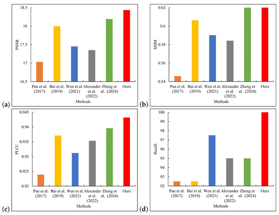 Performance comparison of different methods on digital defocus blur dataset [6,8,10,12,33]. (a) PSNR; (b) SSIM; (c) PLCC; (d) Recall.