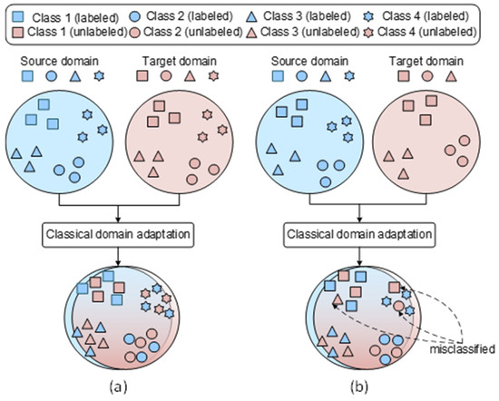 Illustration of transfer fault diagnosis scenarios addressed by classical domain adaptation methods: (a) label-consistent fault diagnosis scenario; (b) partial fault diagnosis scenario.