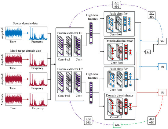 Among these approaches, adversarial-based domain adaptation has gained considerable traction in the fault diagnosis community because it can learn domain-invariant features without target labels and mitigate covariate shift via a discriminator–extractor game (commonly realized with a gradient-reversal layer, GRL). Stable training typically benefits from scheduling the adversarial signal, balancing batch composition across domains (and per target when multiple targets are used), and lightly regularizing the discriminator; nevertheless, sensitivity to hyperparameters and the risk of negative transfer under partial label mismatch remain practical challenges. Within this line, GAN-based formulations have been widely explored to address variable operating conditions, noisy datasets, and limited fault samples [24]. For instance, Zou et al. [25] handled these issues with a GAN-based model; Chen et al. [26] proposed an adversarial domain transfer network for fault diagnosis between mismatched domains; Guo et al. [27] generated synthetic fault data to augment the training dataset under diverse operating conditions; and Han et al. [28] developed an adversarial framework specifically designed to address data imbalance in scenarios with few labeled samples.