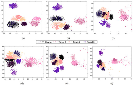 Feature exploration via t-SNE. The representation corresponds to the features learned by the different methods through Tasks T1, T2 and T3. (a) MTAL-PFD. (b) DANN. (c) DCA. (d) TCA. (e) TrAdaBoost. (f) CORAL.