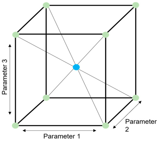 The Design of Experiments (DoE) [19] is a statistical methodology designed to obtain the maximum amount of information from the minimum number of experiments. Instead of evaluating every possible combination of factors, DoE evaluates only selected experimental points according to the factor levels, thereby identifying the optimal conditions. A conceptual diagram is shown in Figure 1.