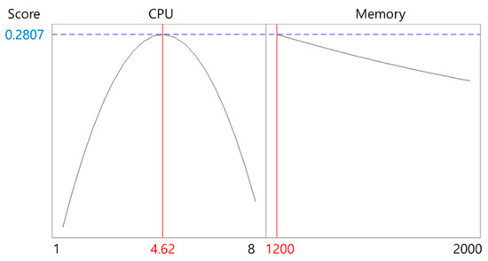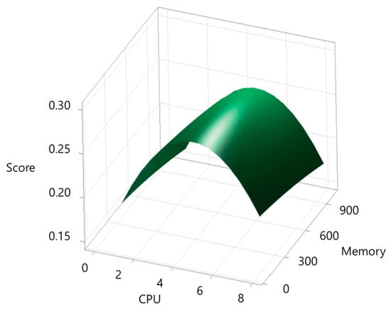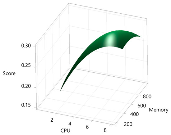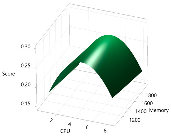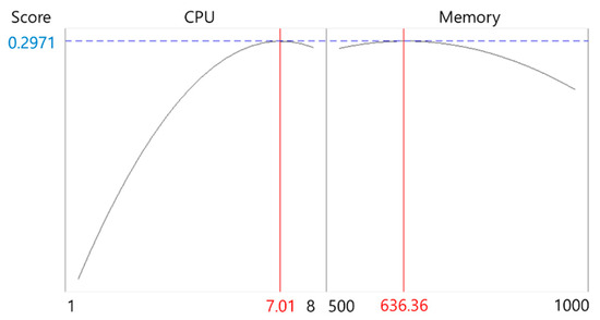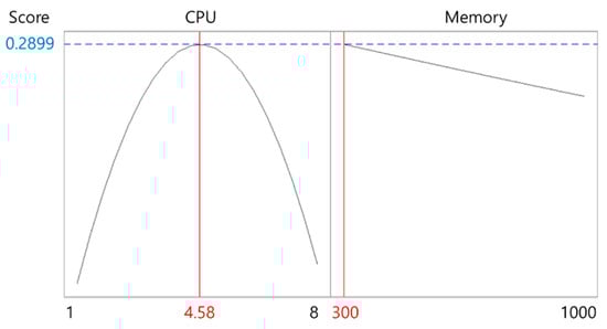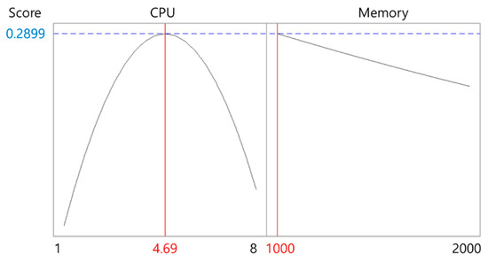Based on the scores derived from execution time and cost, response surface plots were generated, and optimal resource points were identified using a response optimization tool. Figure 2 shows the response surface plot for the c-ray application, while Figure 3 presents the optimal response point. According to Figure 3, the optimal resource size for c-ray was 4.68 CPU cores and 100 MiB of memory, with a desirability value of 0.9178.