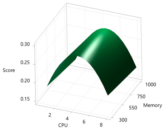 The same method was applied to the other applications. Figure 4, Figure 5, Figure 6 and Figure 7 present the response surface plots for each application, and Figure 8, Figure 9, Figure 10 and Figure 11 show their corresponding optimal resource points.