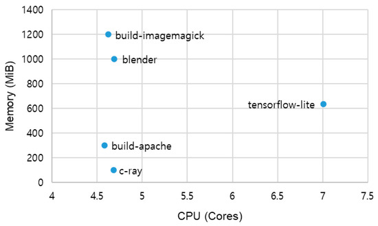 Table 7 summarizes the optimal CPU and memory sizes derived for each application. The results indicate that most applications achieved optimal performance at approximately 4.6 CPU cores, while the AI inference workload (tensorflow-lite) required significantly higher CPU resources (7.01 cores). For memory, the optimal size ranged from 100 to 1200 MiB, depending on the application’s characteristics. These derived optimal resource sizes were directly applied to the Kubernetes custom scheduler, enabling adaptive scheduling that dynamically adjusts resource requests according to each application’s performance profile. To provide a clearer visualization, Figure 12 presents a scatter plot of the optimal CPU and memory allocations, highlighting the distinct resource requirements across different application types.