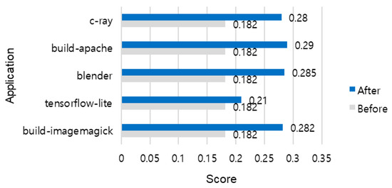The results for other applications (Table 10) also show the same trend. In particular, build-apache improved by about 1.593 times, blender by about 1.566 times, and build-imagemagick by about 1.549 times in performance efficiency. The relatively smaller improvement in tensorflow-lite is due to the nature of AI inference tasks, where CPU parallel computation plays a major role, leaving less room for resource reduction. To further highlight these improvements, Figure 13 provides a visual comparison of the normalized performance scores before and after optimal resource allocation across all applications.