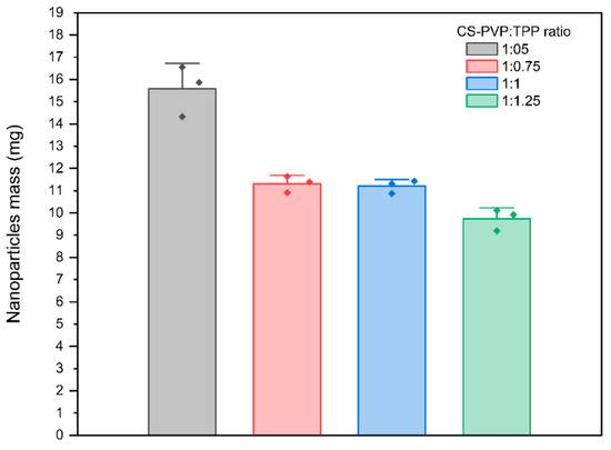 CS-PVP nanoparticles mass after the freeze-drying process at different CS-PVP:TPP ratios.