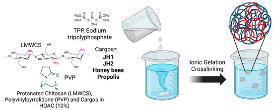 In this context, CS and PVP have individually been used in drug-delivery systems [15,16], and their combination has also been explored previously. CS:PVP studies generally evaluate single cargo classes or present limited cross-comparisons across chemically diverse agents [17,18]. In contrast, here we wish to establish a single, optimized CS:PVP platform that encapsulates both synthetic bis-THTT derivatives (JH1, JH2) and natural apitherapy products (honey, propolis) and interrogates, under uniform synthesis and testing conditions, the impact of cargo chemistry on encapsulation (EE/LC), release in artificial gastric fluid, antimicrobial performance, and 3T3 cytocompatibility. This design allows for a direct, controlled comparison between synthetic and natural agents within the same CS–PVP matrix, clarifying how matrix–cargo interactions govern particle formation, stability, and function. By aligning materials optimization with comparative physicochemical characterization and biological readouts, our study delivers an integrated view of how CS–PVP can serve as a versatile, biocompatible carrier for chemically distinct antimicrobials, addressing an underexplored area in the CS:PVP literature.