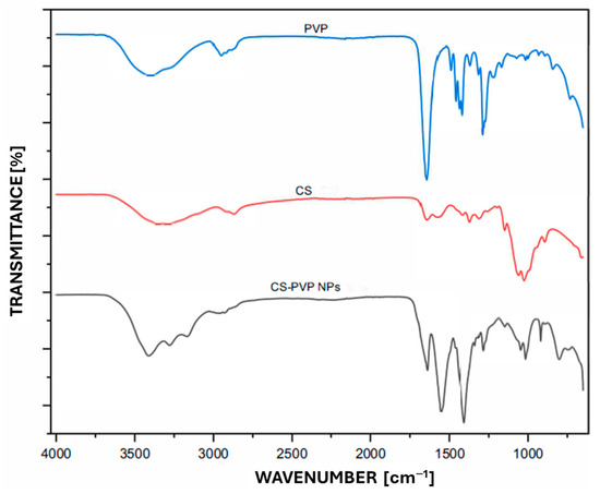 FTIR spectra of PVP, CS, and CS-PVP NPs.
