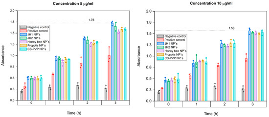 Cytotoxicity analysis demonstrated that all investigated NPs have low cytotoxicity and maintain high cell viability in 3T3 mouse fibroblasts at 5 and 10 μg/mL, with the same trend, regardless of concentration. Throughout the 3 h of incubation after MTT addition, JH1 NPs presented the highest average absorbances. JH2 NPs showed absorbances slightly lower than those of JH1 NPs, supporting their low cytotoxicity. The honey bee NPs and propolis NPs also present high absorbances at 3 h, indicating high cell viability and low cytotoxicity, although slightly lower than the JH1 NPs and JH2 NPs (Figure 11).