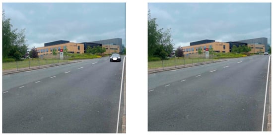 Example of pictures used in the online questionnaire to help participants visualise different distances (a small, automated car approaching the protagonist from 40 and 80 m from up a hill, respectively).