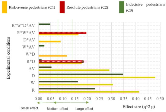 Second, the effects of all the factors on crossing decisions were found to be significant at p < 0.001 with varying effect sizes. A value equal to or more than 0.14 signifies a large size effect, equal to or more than 0.06 signifies a medium size effect, and less than that signifies a small size effect [59]. Table 4 shows that road gradient, weather and distance had a large effect size, whereas the type of vehicle had a medium effect size on the crossing decision.