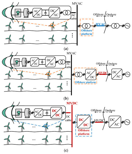 Wind power collection and transmission topology. (a) AC collection and AC transmission scheme; (b) AC collection and DC transmission scheme; and (c) DC collection and DC transmission (all-DC) scheme.