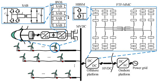 As shown in Figure 2, the system topology of the far-offshore all-DC wind farm comprises three primary components: the collection network, offshore converter platform, and onshore converter platform. The collection network consists of eight radial feeder lines, each integrating five 10 MW DC wind turbines interconnected by 1 km submarine cables (approximately four times the rotor diameter [22]), with each feeder connected to the collection bus through submarine cables of varying lengths. For the DC wind turbines, the turbine-side AC/DC converter delivers an output voltage of 6.6 kV, which is subsequently boosted to ±33 kV by a medium-voltage DC/DC converter housed in the nacelle for connection to the DC collection lines; this conversion stage employs an IPOS-configured SAB converter [23]. Current measurement devices are installed at both the outlet of each collector line and each wind turbine. The offshore converter platform utilizes a FTF-MMC [24] to elevate the voltage to ±200 kV for high-voltage transmission, while the onshore platform employs a MMC to interface with the 500 kV AC transmission network.