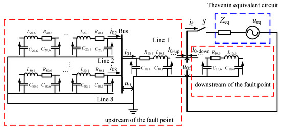 The zero-mode equivalent circuit for the collection network of the all-DC wind farm in Figure 1 after the occurrence of a SPG fault is shown in Figure 3. Each collection line containing five wind turbines is equivalent to six cascaded π equivalent lines; for example, R10,1, L10,1, and C10,1 are, respectively, the equivalent resistance, inductance, and ground capacitance of the convergence line from the bus to the first wind turbine of Line 1. The fault resistance, the virtual power supply, and the line-mode equivalent network of the system in the equivalent circuit are equivalent to a two-port network, and the equivalent power supply and equivalent impedance are ueq and zeq, respectively. In addition, i01–i08 is the zero-mode current at the outlet of the line, if is the fault point current, i0,up and i0,down are the zero-mode current injected into the fault point upstream and downstream of the fault point by the fault line, respectively, and u0 and u0f are the bus zero-mode voltage and the fault point voltage, respectively. The switch S represents the fault point state; when the switch S is disconnected, the system operates normally, and when the switch S is disconnected, the SPG fault occurs.